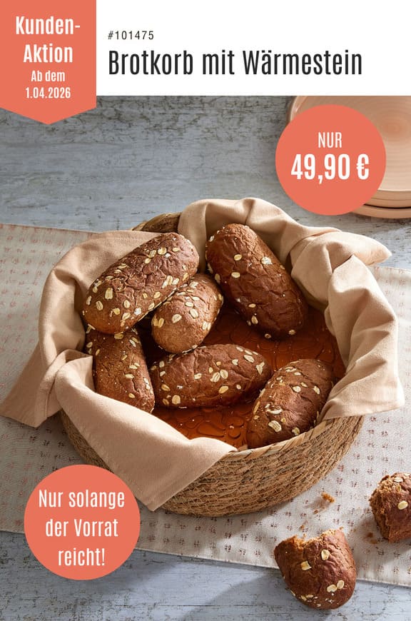 Kundenaktion vom 01.- 13. April gibt es die Quadratische Ofenhexe® mit Servierhexe in grau für 99 € statt für 119,90 € und vom 1.- 30. April 2026 gibt es außerdem noch den Brotkorb mit Wärmestein ( Beschreibung ) für 49,90 € sind sie das Highlight für jeden Tisch!